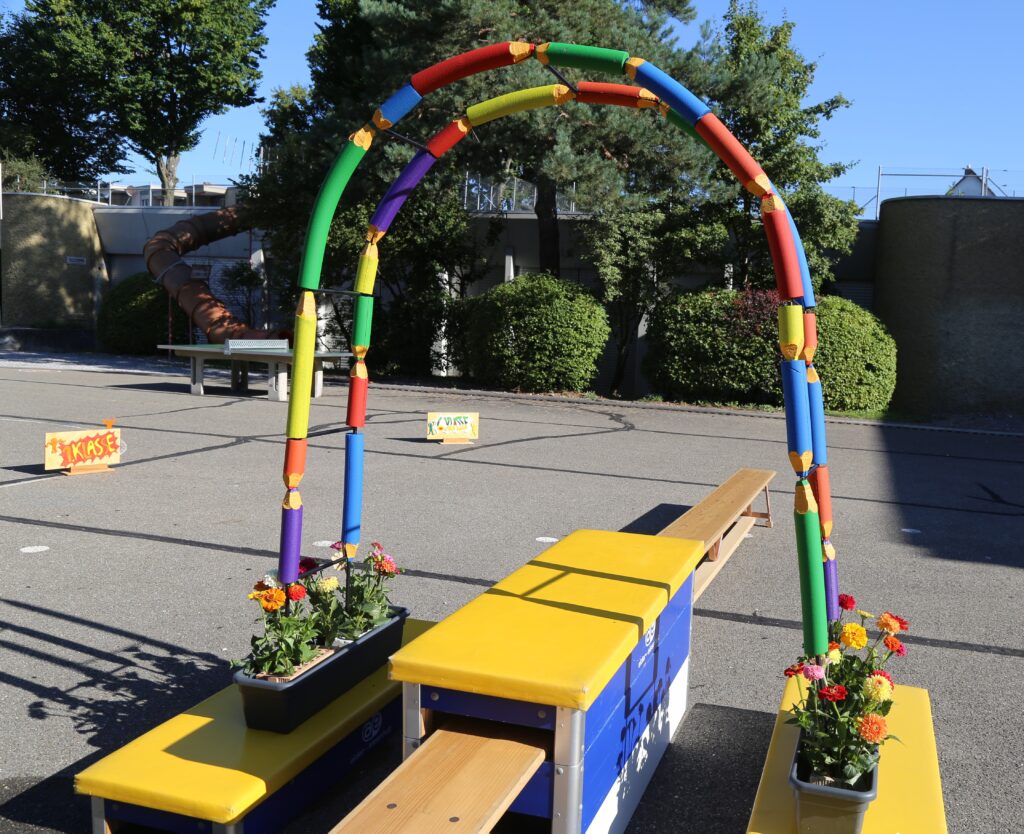 Im Steinacker feiern wir den Start jedes Schuljahr aufs Neue mit unserem Begrüssungsritual, bei welchem der Farbstift- und Sonnenblumenbogen eine wichtige Rolle spielt.