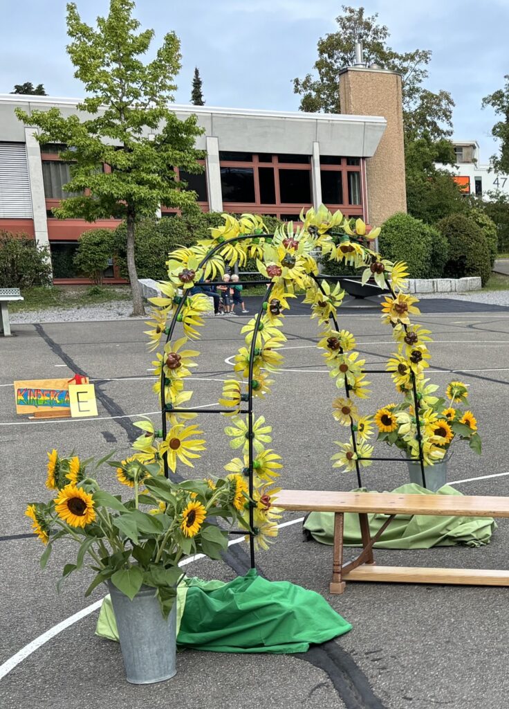 Am Dienstagmorgen begrüsst der Sonnenblumenbogen unsere 1. Kindergartenkinder, welche sich begleitet von ihren Eltern durch den Bogen auf den Weg zu ihrer Kindergartenklasse machen.