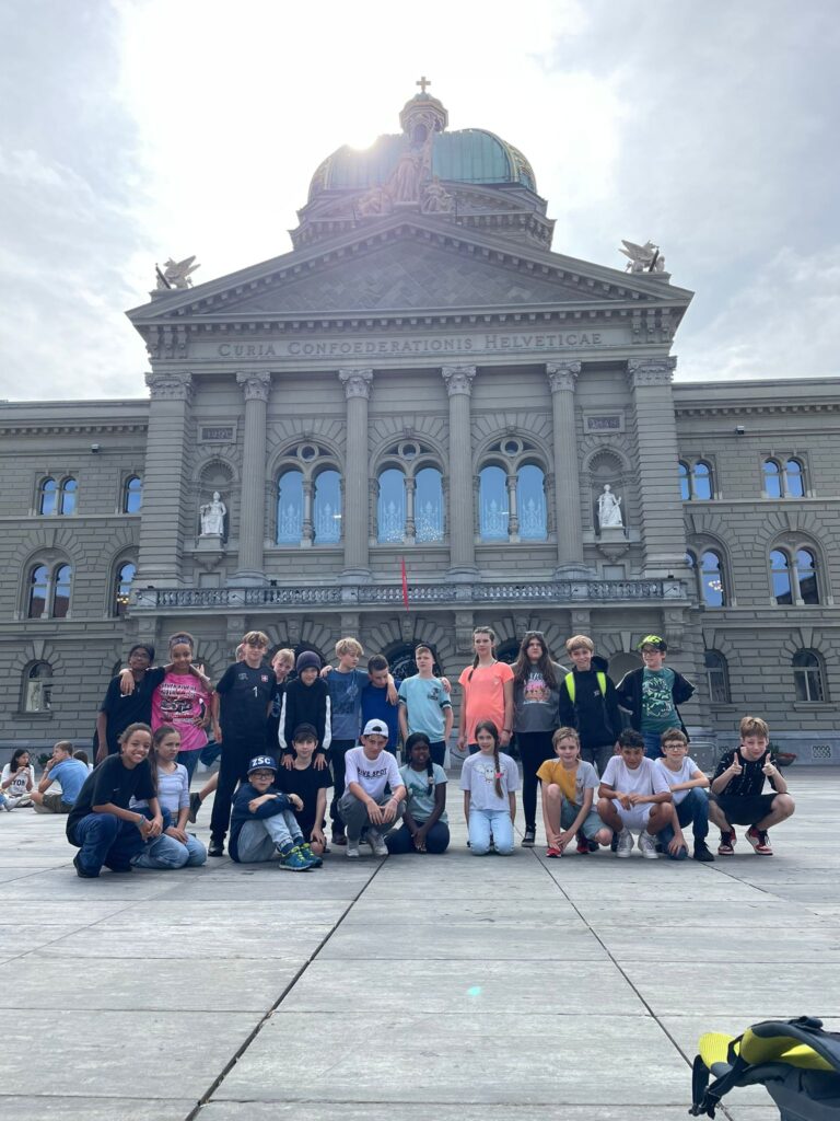 Donnerstag: Mit dem Bus fuhren wir nach Bern und liefen zum «Zytglogge-Turm». Dort erwartete uns eine Stadtführerin mit einem Stern-OL. In Gruppen eingeteilt, bekamen wir ein Arbeitsblatt, das einen Standort zeigte. Ein Rätsel und eine Aufgabe waren auch noch dabei, die man an dem Standort lösen musste. Das Mittagessen genossen wir auf der Münsterplattform. Anschliessend ging es weiter zum Bundeshausplatz und anschliessend zum Seilpark oder in den Tierpark. Im Seilpark mussten wir zuerst eine kleine Sicherheitsprüfung schreiben und einen Übungsparcour absolvieren, dann ging es endlich los. Den ganzen Nachmittag balancierten wir über wacklige Seilbrücken, über tiefe Schluchten und kletterten durch Spinnennetze. Nach dem feinen Znacht zurück im Lagerhaus, teilte sich unsere Klasse in zwei Gruppen auf. Eine Gruppe schaute einen Film, die anderen machten einen Karaoke- und Discoabend. Als der letzte Lagerabend sich dem Ende neigte, fielen alle erschöpft ins Bett.
