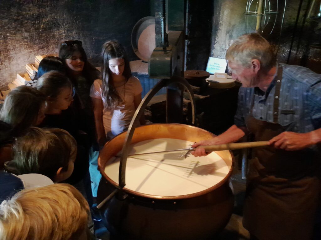 Montag: Am Montag traf sich die 6. Klasse auf dem Schulgelände Obermatt. Nachdem wir unser Gepäck in den Anhänger verladen hatten, traten wir unsere lange Reise nach Affoltern im Emmental an. Dort besuchten wir die Schaukäserei. In einem grossen Kessel wurde die Milch über dem Feuer erwärmt. Wir durften auch mithelfen. Wir machten Feuer, rührten, fischten die Käsemasse aus dem Topf und beschrifteten den Käse. In 4 Monaten werden wir unseren eigenen Käse erhalten. Einige Kinder besuchten den Königsweg, um mehr über die Produktion des Emmentaler-Käse zu erfahren. Später fuhren wir nach Köniz und bezogen das Lagerhaus.