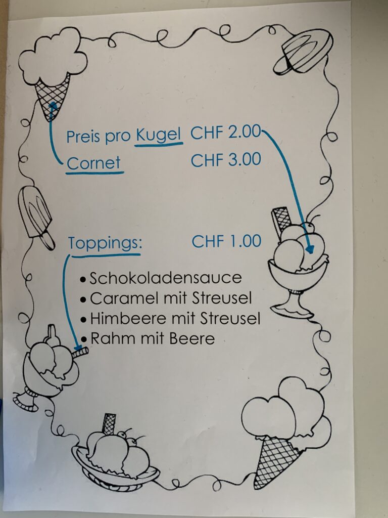 Je nach Klasse waren die Artikel mit einfachen Preisen angeschrieben oder der Schwierigkeitsgrad wurde durch komplexere Preise erhöht, sodass auch Rechnungen mit Multiplikation erforderlich waren. Zum Beispiel mussten in der Pizzeria zum Grundpreis der Pizza noch die zusätzlichen Beläge dazugerechnet werden. Anschliessend galt es, den Kaufenden das korrekte Rückgeld herauszugeben. Dabei rauchten die Köpfe – denn neben dem Rechnen mussten die Kinder auch noch charmant bedienen und gleichzeitig die gewünschten Artikel bereitlegen.