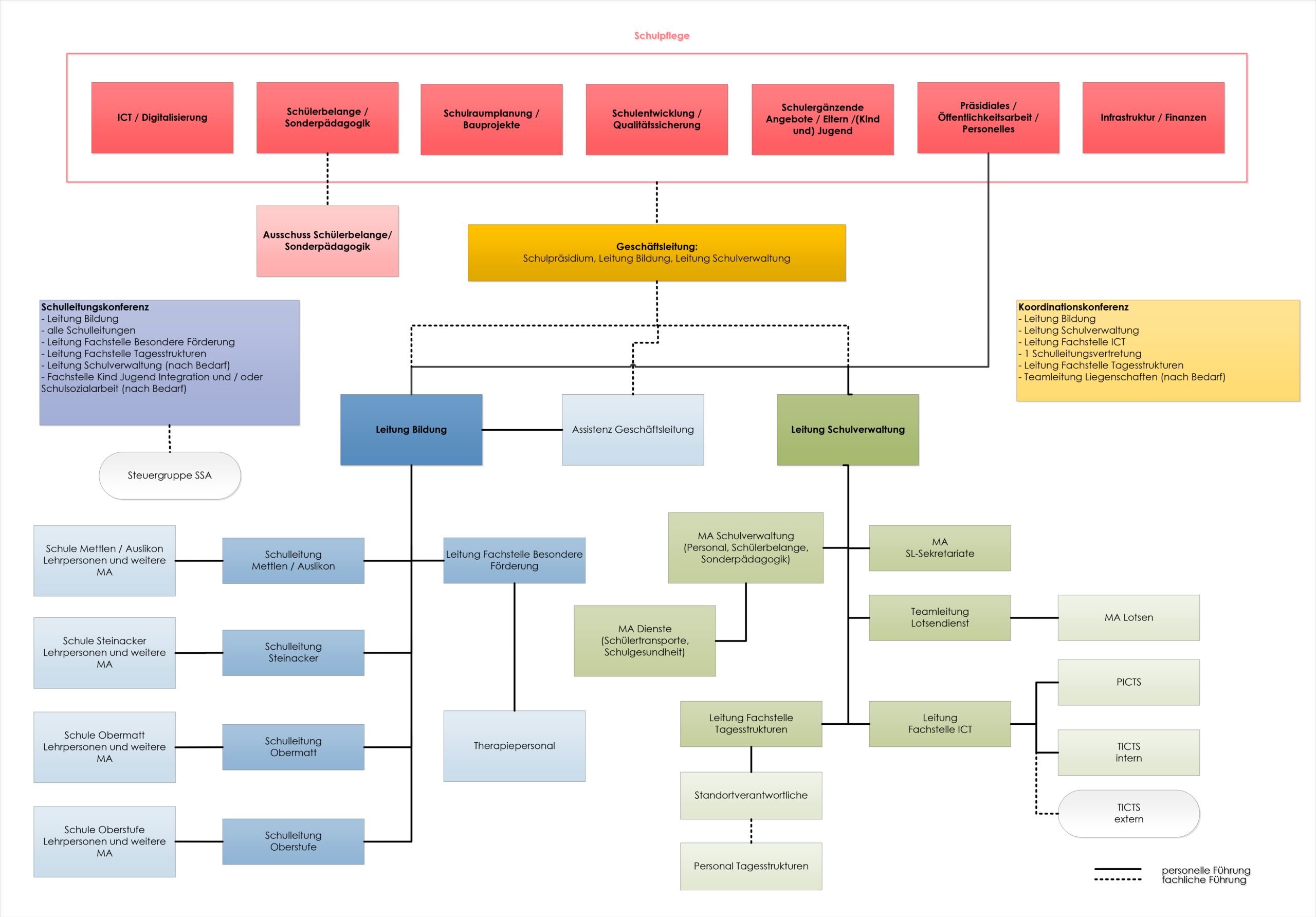 Das nachstehende Organigramm beschreibt die Organisation, die Gremien und Kompetenzen der Schule Pfäffikon ZH. Die Aufgaben der einzelnen Gremien sind im Geschäftsreglement und im Funktionendiagramm festgehalten.