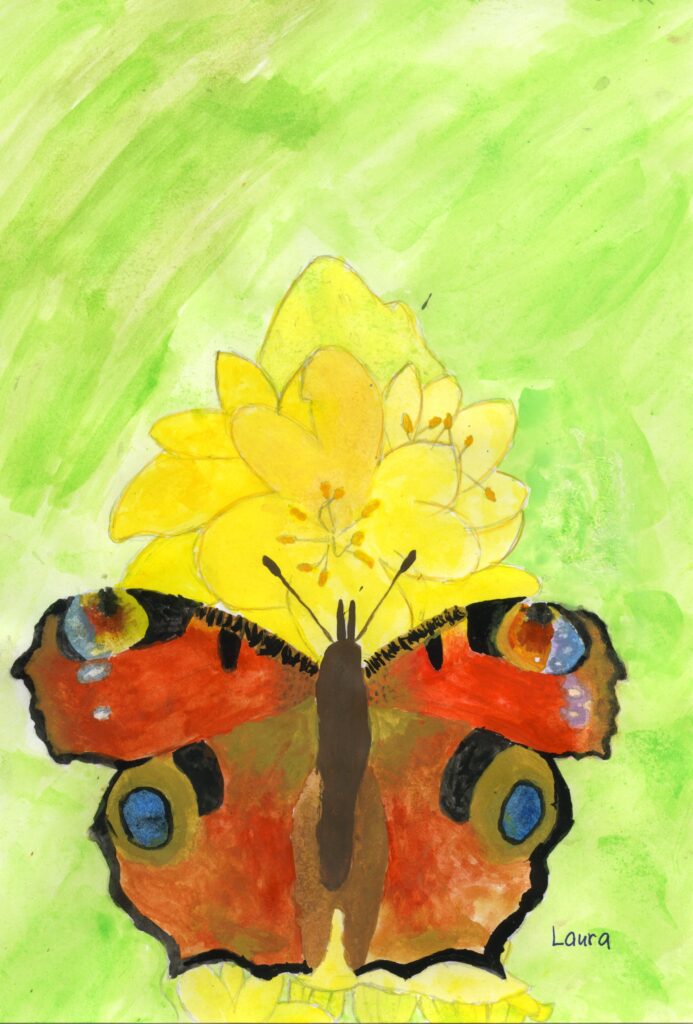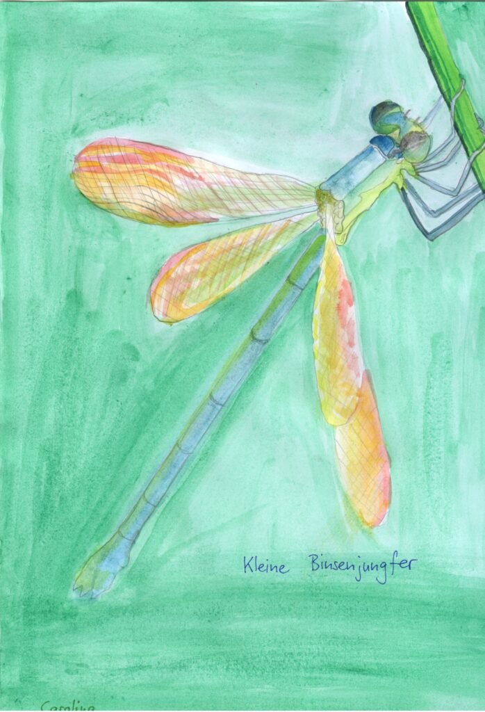 Tagpfauenauge, von Laura & Kleine Binsenjungfer, von Carolina. Inspiriert zu diesen Aquarellen haben uns die Farbfotos im Buch «Die schönsten Insekten der Schweiz», von Thomas Marent